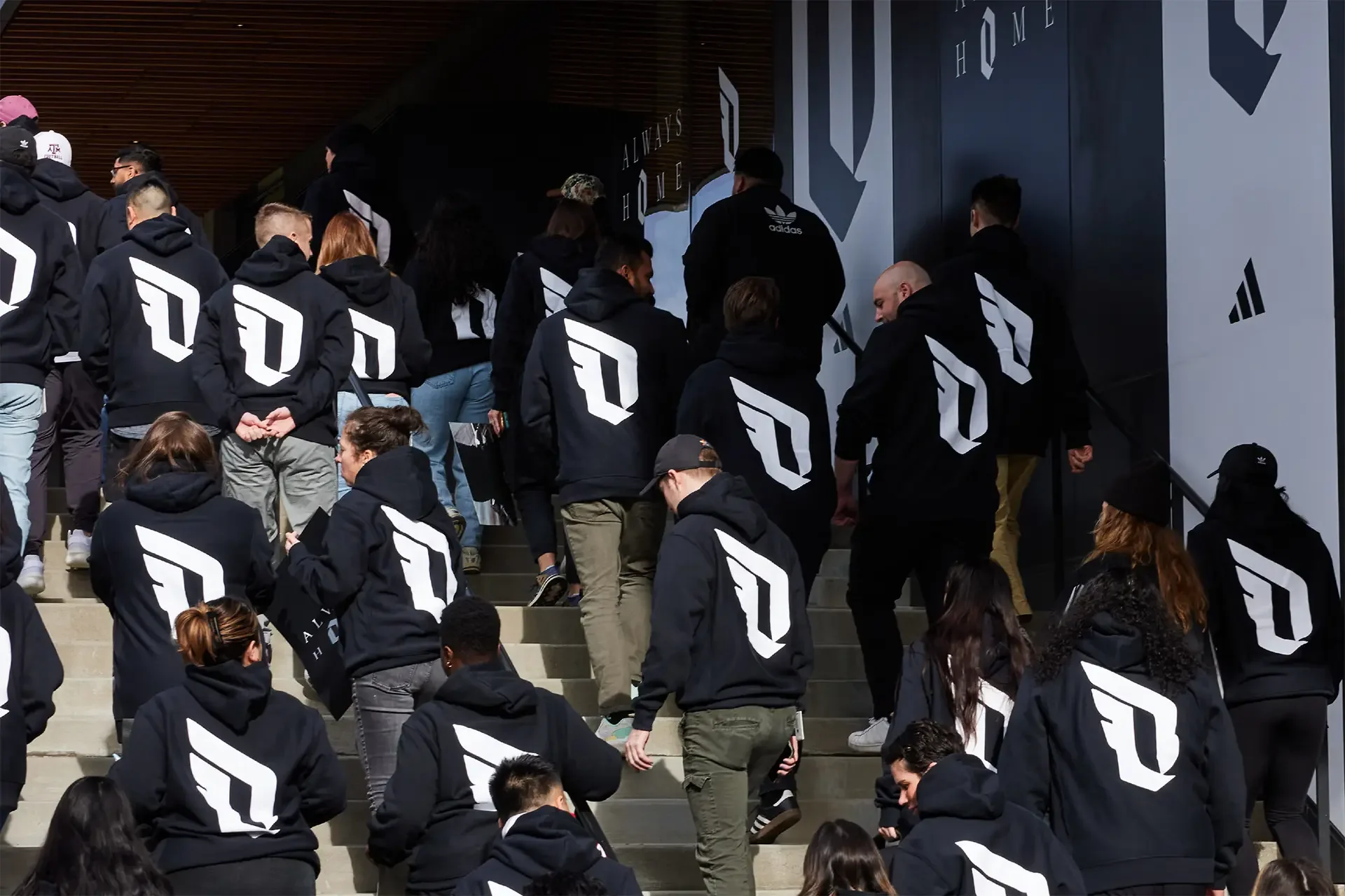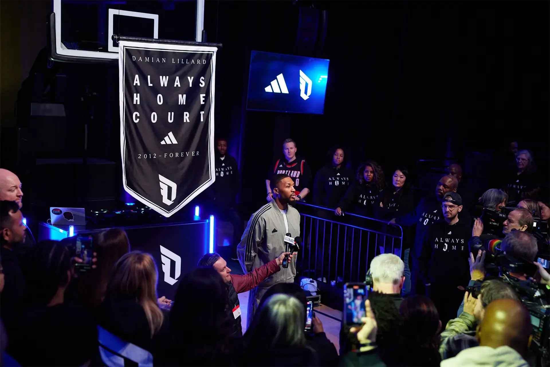 This heartfelt tribute was a collective moment. One strengthened by a crowd of supporters wearing custom ‘Always Home’ hoodies and waving posters that brought the icon’s impact to life. With the village decked out in honor of Dame, including massive building wraps and banners throughout, the community came together to pay homage to a legend. A national championship-style banner was raised, and Dame laid down his permanent signature at center court of adidas gymnasium.